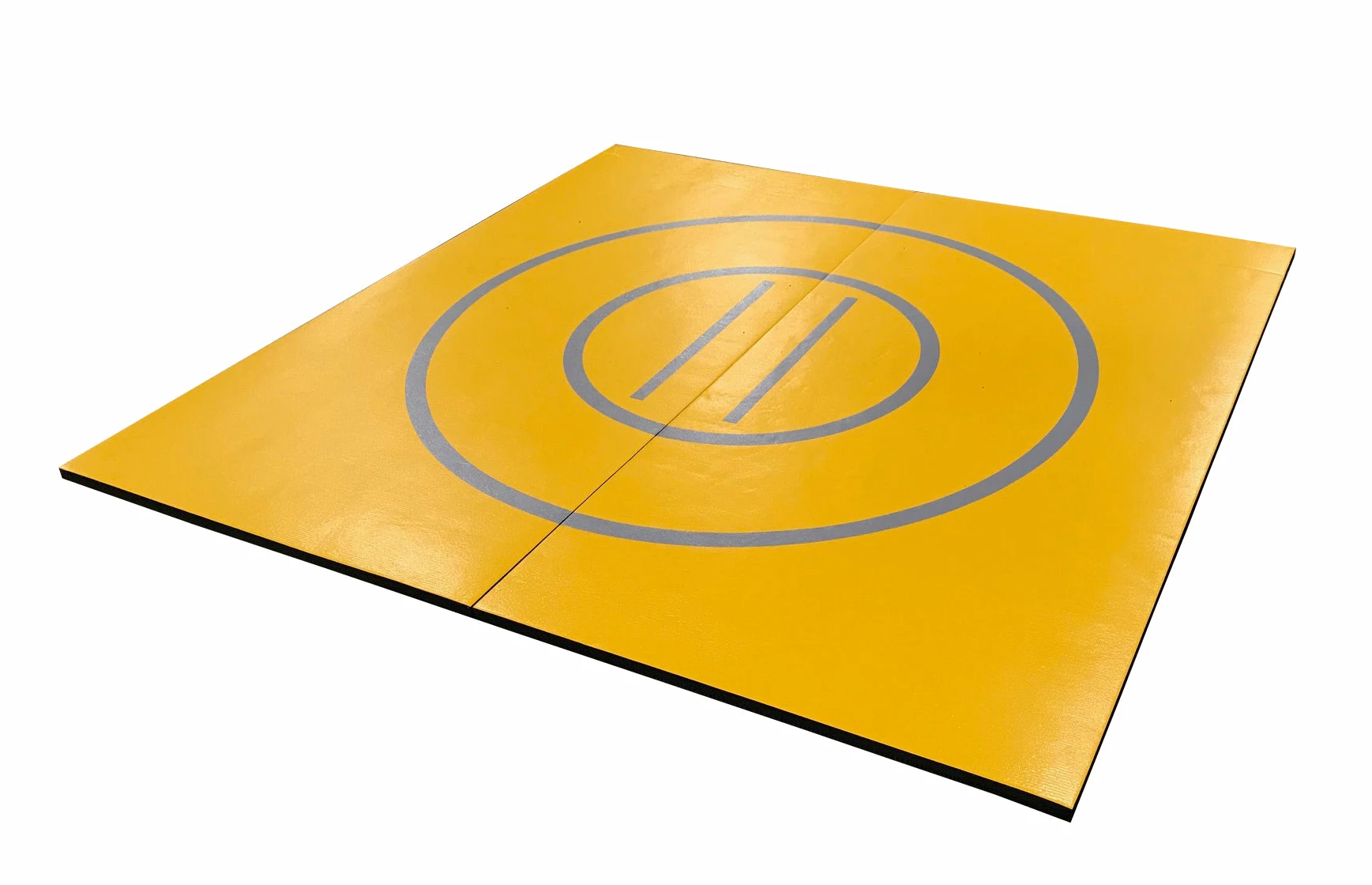 The Roll-Up 8′ x 8′ Gold and Gray Wrestling Mat is made specifically for use in schools, clubs, and home gyms. The padding is 1 3/8″ thick cross linked polyethylene foam which provides support for wrists, ankles and throw downs. The mats are shock absorbent enough to be used directly on concrete flooring. The mat is covered in 14 ounce Class A fire rated vinyl that is antimicrobial, antifungal, and will not support mildew. Dirt contaminants are easily cleaned with non-abrasive cleaner. The 8′ x 8′ Wrestling Mat comes in two separate light weight 4′ x 8′ mats which roll out to cover an 8′ x 8′ floor space.
